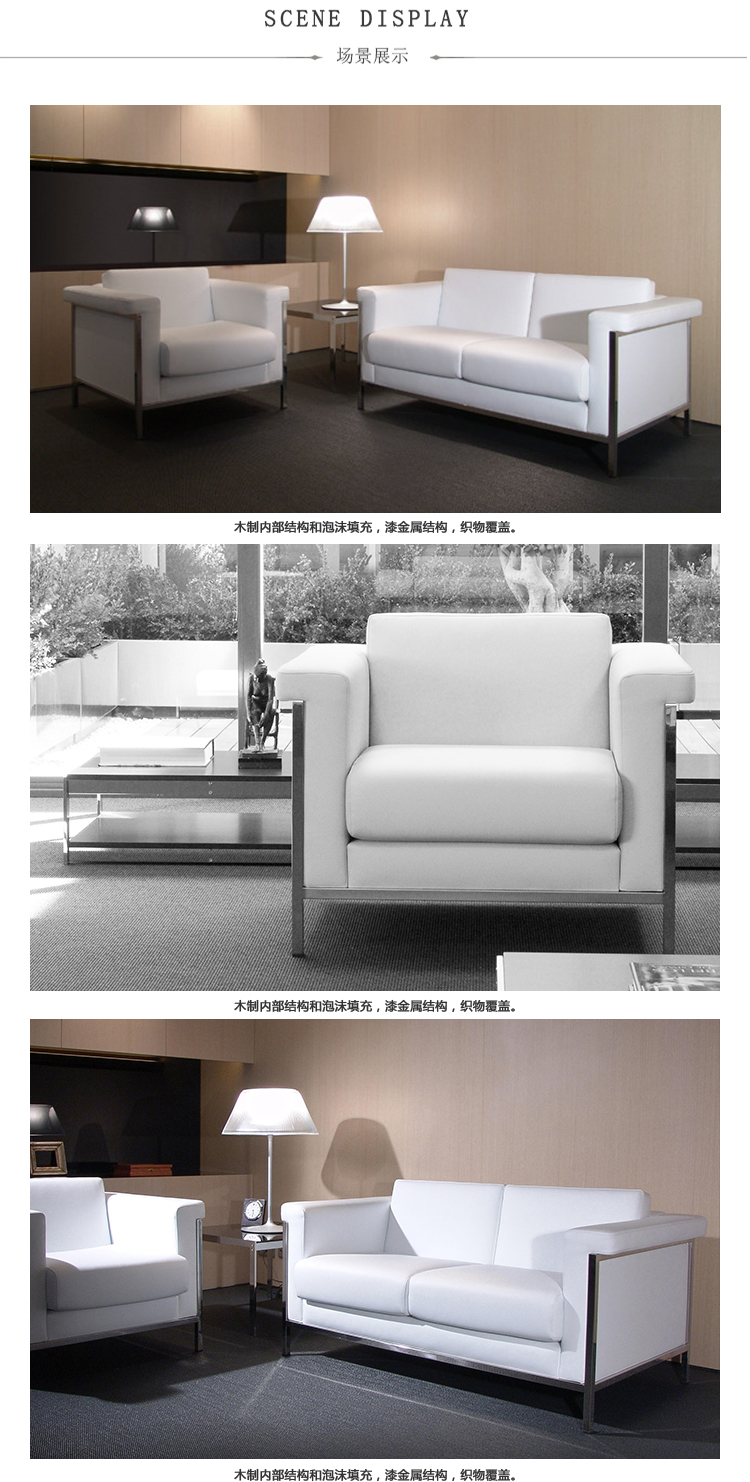 安装在黑色漆金属无框架上。一体式框架,无接头。低靠背与扶手齐平。可拆卸座椅和靠背垫。