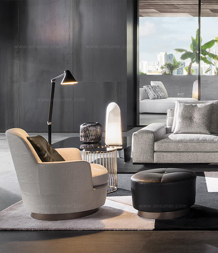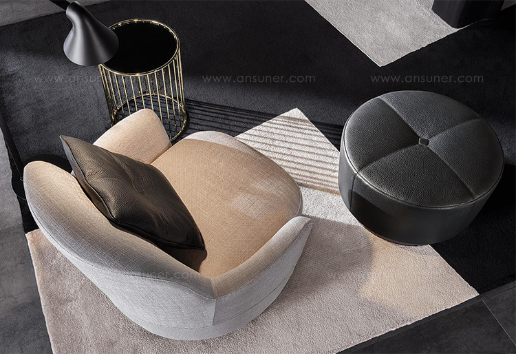 底座可以旋转的Jacques沙发拥有柔软的坐垫和靠背,带来绝佳的舒适感,尤其适合打造休闲放松的空间,可以搭配Song边几和脚凳,达到相得益彰的效果,边几不仅可以用来放置台灯,也可以用来放置各种小物件。