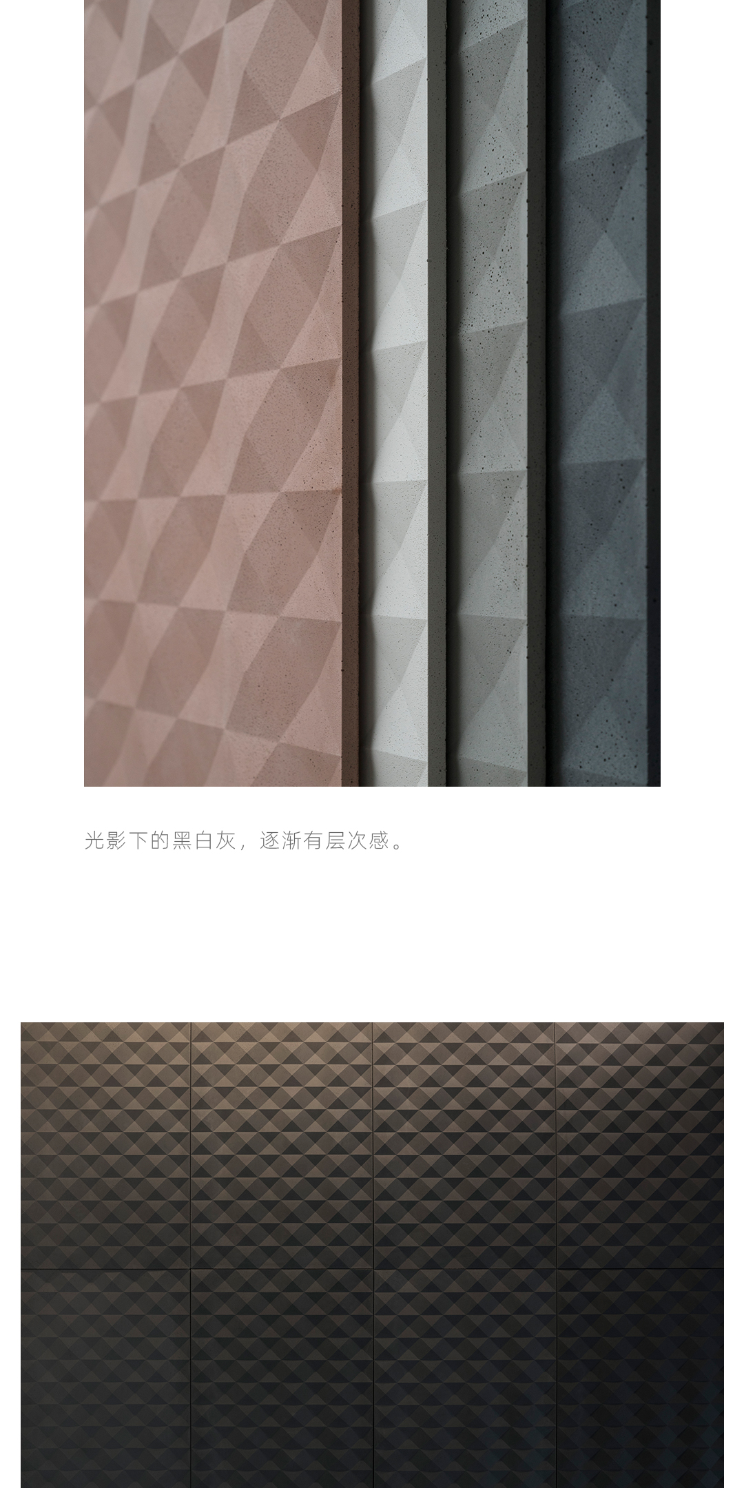 看似单一灰调的墙砖在黑暗中整齐划一如同方针队列般严谨,当光从建筑的缝隙溜进室内,投射其上的光影折射与流逝,赋予了混凝土生命。