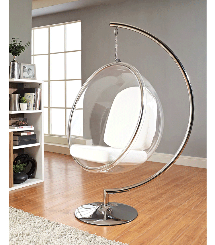 "芬兰家具设计大师艾洛.阿尼奥(Eero Aarnio)在德国品牌Adelta的代表作Bubble Chair(泡泡椅)。灵感来自于Ball Chair,但尺寸略小,而且椅子是以压克力制成,光线可以从四面八方透进。压克力加热充气,使它成为皂泡状,加入一个钢圈和椅垫即成。这样一组貌似轻巧的家具,但却能负重至少200公斤以上,由天花板垂链将Bubble吊起,宛如漂浮于空气中的泡泡一般!洁净面透明!带着科技感的椅子,又像置身于太空中,未来感十足。摆脱了椅子就是要放在地板上的刻板印象。最适合为摄影背景之用。坐在这把椅子上,即使身处一个拥挤的空间,也有点遗世独立的奇妙感觉。挪威一家电话公司在总公司入口大厅吊了几把这样的椅子,让客户可以在打行动电话时,有个宁静的空间。这件作品在1966年的科隆家具博览会上一举成名。