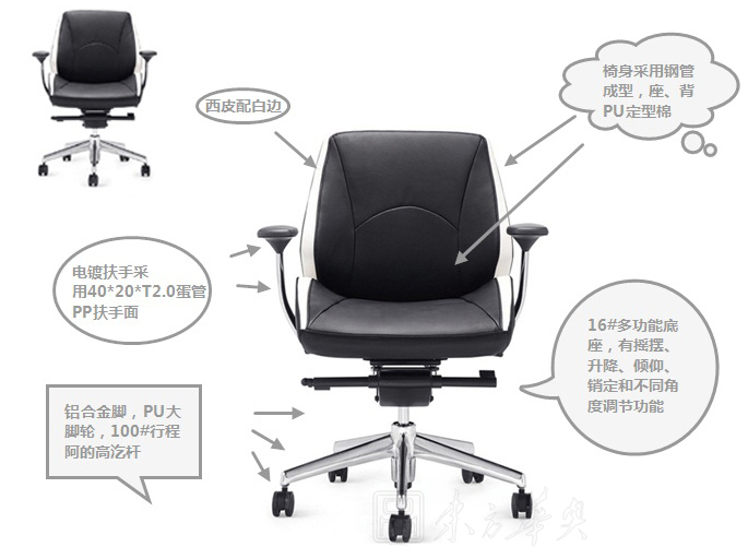 A:椅身采用钢管成型,座、背PU定型棉,西皮配白边.铝合金脚,PU大脚轮,100#行程阿的高汔杆。