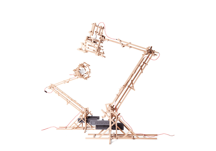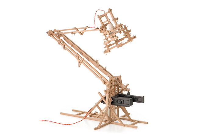 "in a brave new world imagination is free to produce a complex lamp with simple materials, translating the warm soul of the oak wood in a mechanic way.""the brave new world lamp by design duo fresh west started as a concept piece of random thought-initiated construction. Following the example of old far eastern bamboo scaffolding or simply of our childhood meccano creations, the brave new world lamp was developed without a design or plan in place. Nevertheless each piece of wood is carefully notched and pegged together to form an integral part of the overall mechanical structure." Material: Oak frame and cast iron balancing weights"