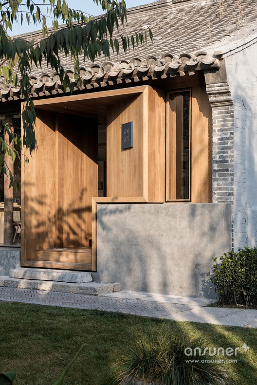 在灰色水磨石的连接下,沿河的立面用节奏较为舒缓的矩形体块排布开来。其中主入口连接了室内吧台区域,将它们组合在一个盒子当中嵌入房间,形成了简洁明确的功能划分。为书籍展示和阅读讨论设计的大工作桌放置于敞亮的玻璃窗旁,停留在此能感受饱满和谐的阳光和窗外恰到好处的小河垂柳。西侧格栅折叠窗设计巧妙地在回应传统装饰语言的同时也可用于夏日遮阳。