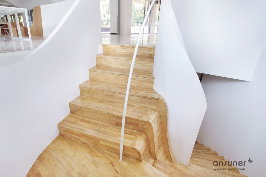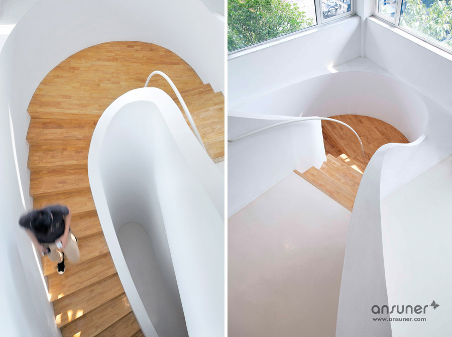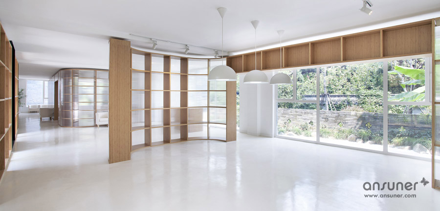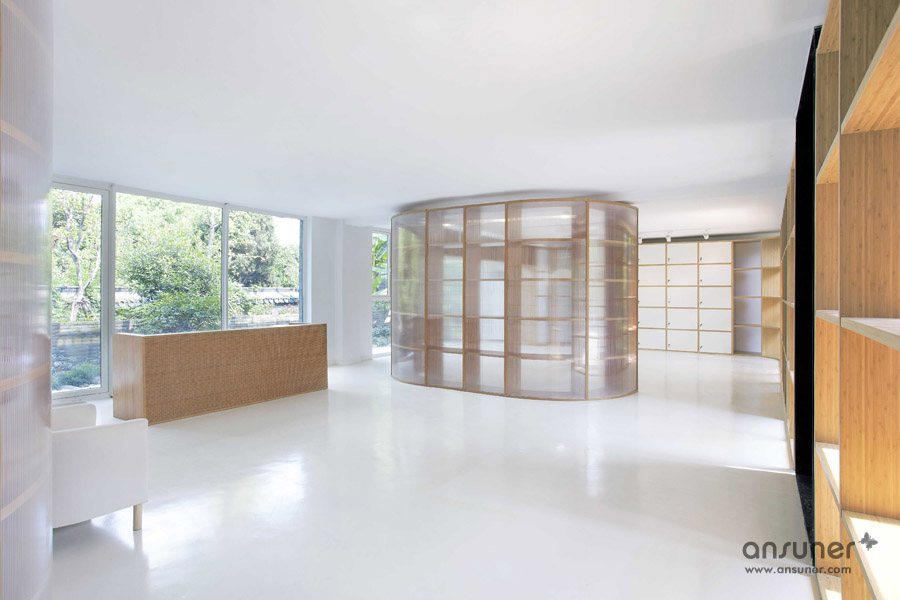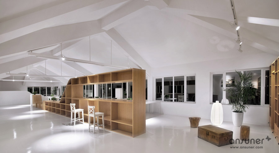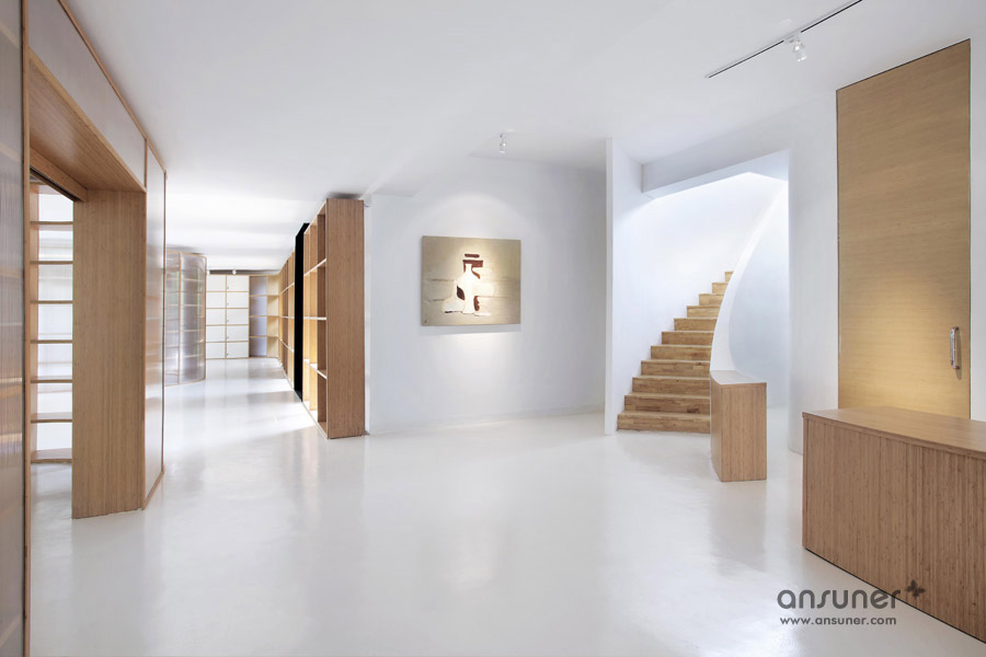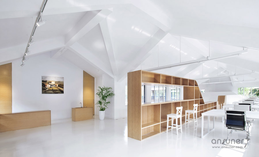 该办公室内装设计项目位于浙江省杭州,虽然基地拥有良好的室外自然景观条件,但原有建筑内部阴暗压抑:已有结构的1层层高3.3m ,梁下高度2.6m, 空间比例相对低矮;2层空间的高度具有优势,但1,2层的联系较弱,原有建筑的双层特点也并没有展现出来。