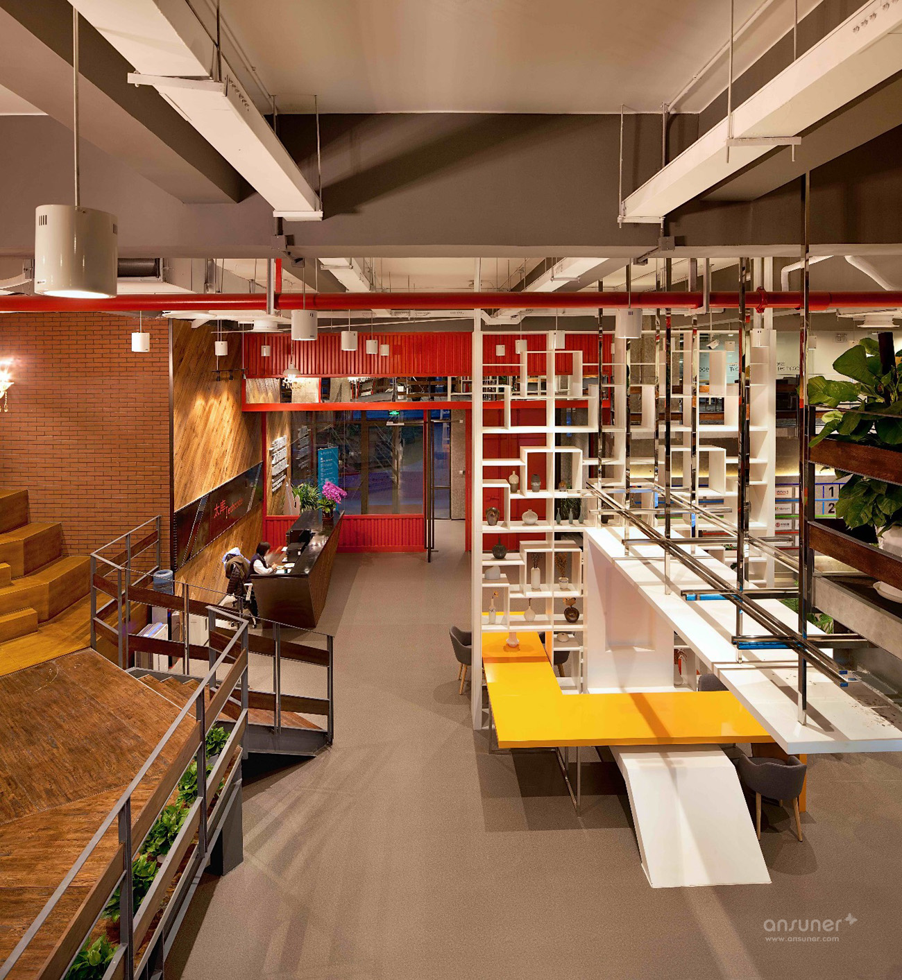 入口处醒目的大红色门厅,墙壁饰面采用集装箱纹理,与接待台后的木色饰面即形成了鲜明对比,同时又烘托出了温暖、开放的环境氛围,独特的工业风格特色让人第一眼就留下深刻印象。铁制的接待台经过特殊锈化处理,展现出了斑驳仿旧的视觉效果。
