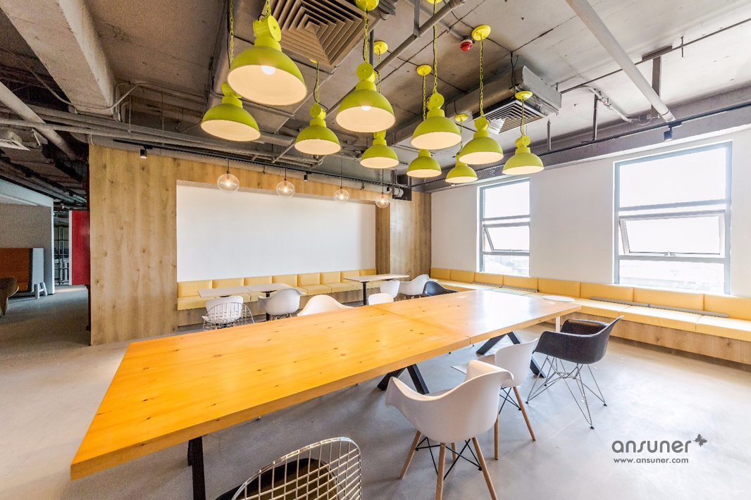 圆弧形的会议室和休闲区是本次设计的核心,也是凸显共享和交融的重点,通透的玻璃会议室和无遮拦的休闲区设计形成完美的结合。休闲区的设计得益于当今的科技发展,移动式办公成为可能。标注办公桌渐渐转化为共享办公桌,多元化的移动办公方式提供了更丰富的选择。个人固定办公桌时代已经成为过去,员工要考虑的事情就是选择哪里更合适今天的心情、今天的工作。