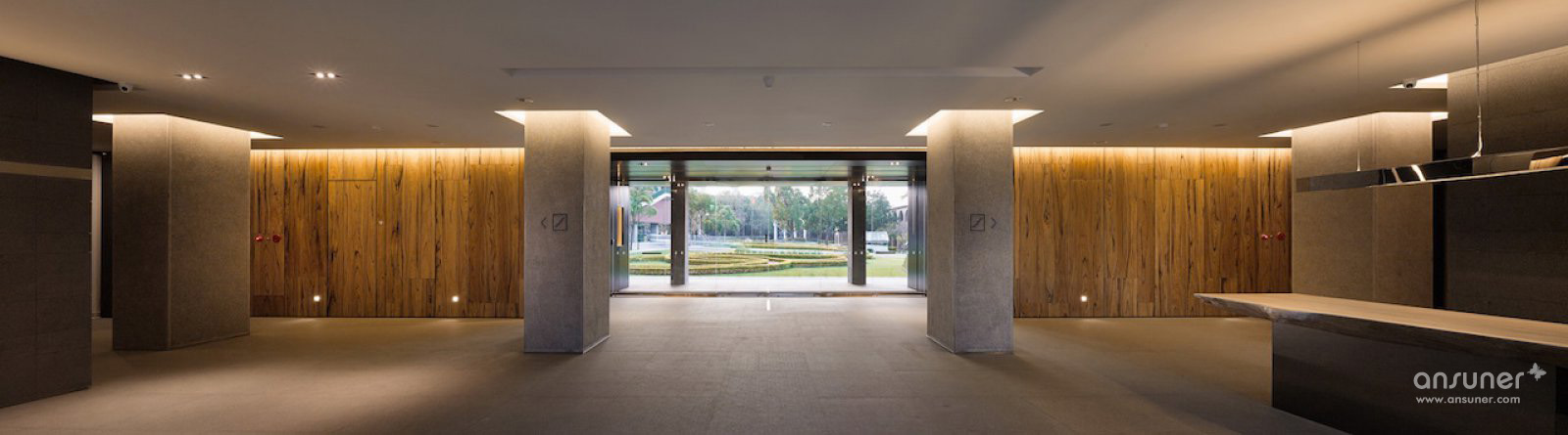 柱顶及长廊墙上的间接灯光溢流而下,柱子与墙的边界消失在天花板内。